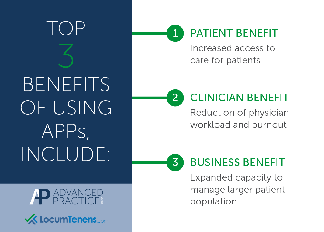 Recent survey data of healthcare organizations shows that implementing sufficient APP support within your workforce is a retention tactic for physicians. Implementing APPs not only contributes to patient care coverage but creates an enjoyable, supportive atmosphere for physicians to maximize time providing direct patient care.